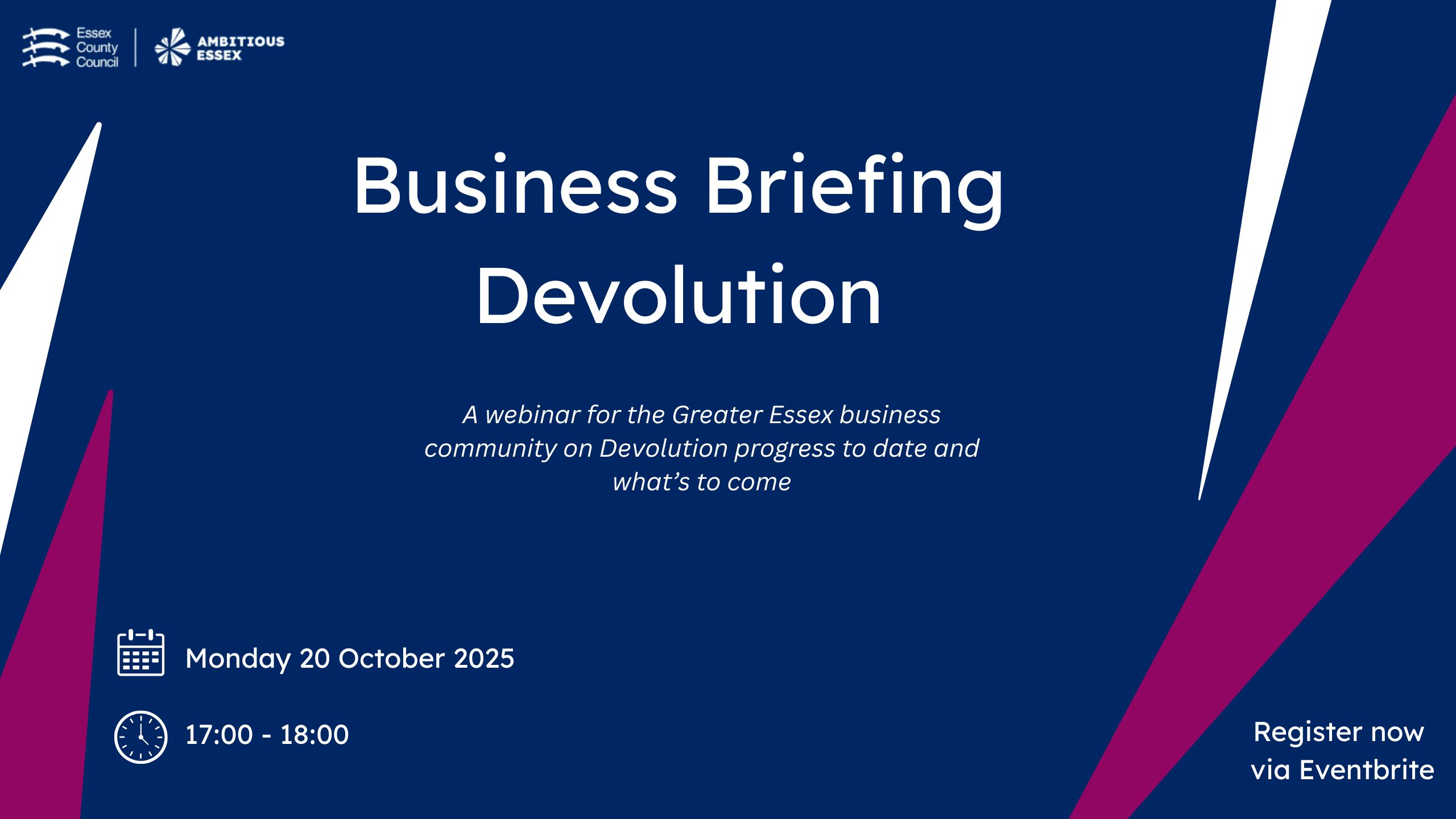 Essex County Council will be holding an online webinar designed for local businesses to gather information and ask questions around the Devolution agenda, and what it could mean for them.